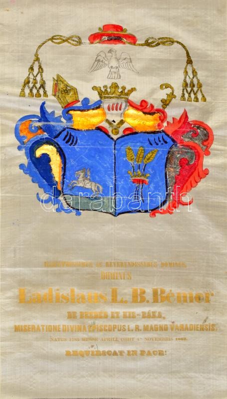 https://www.darabanth.com/en/354-Online-auction/354.0/Art-and-other-collectibles/Historical-documents-manuscripts~500019/cca-1862-Bemer-Laszlo-nagyvaradi-puspok-halotti-cimere-festett-selyemkep-nyomtatott-szove~II2019855