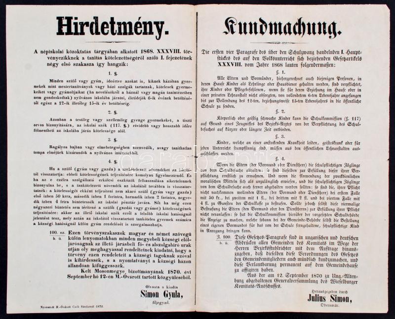 Description: 1846 Leirat a tankötelezettség felettiek számára felállított vasárnapi tanodákkal kapcsolatban 5 old. + 1870 Tankötelezettség emeléssel kapcsolatos hirdetmény. 42x34 cm