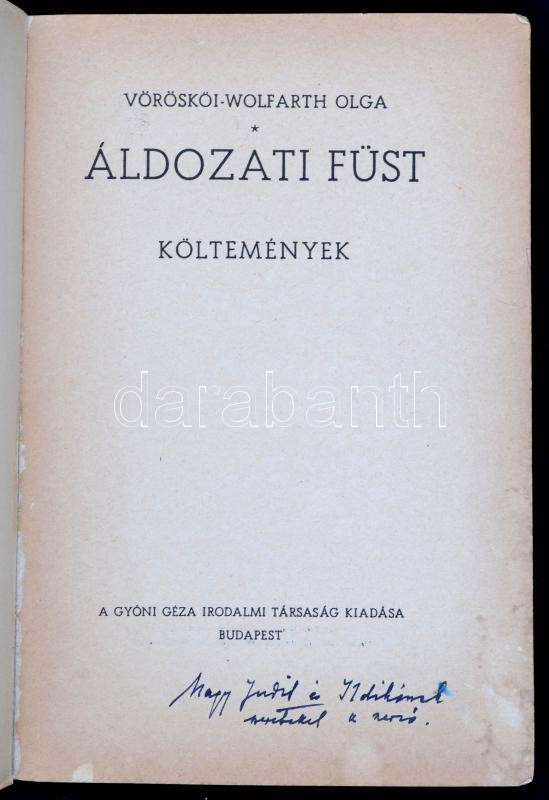 Vöröskői-Wolfarth Olga: Áldozati füst. Költemények. Bp., é. n., Gyóni Géza Irodalmi Társaság. A szerző dedikációjával. Papírkötésben, jó állapotban.
