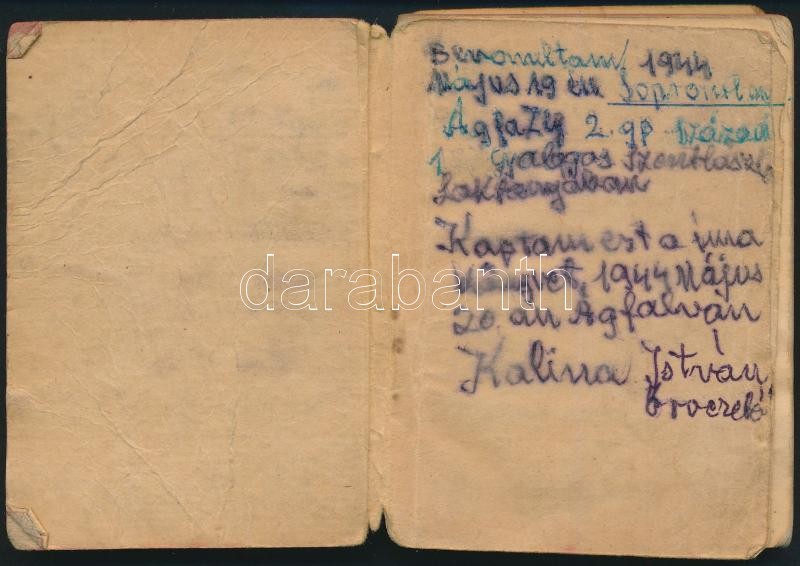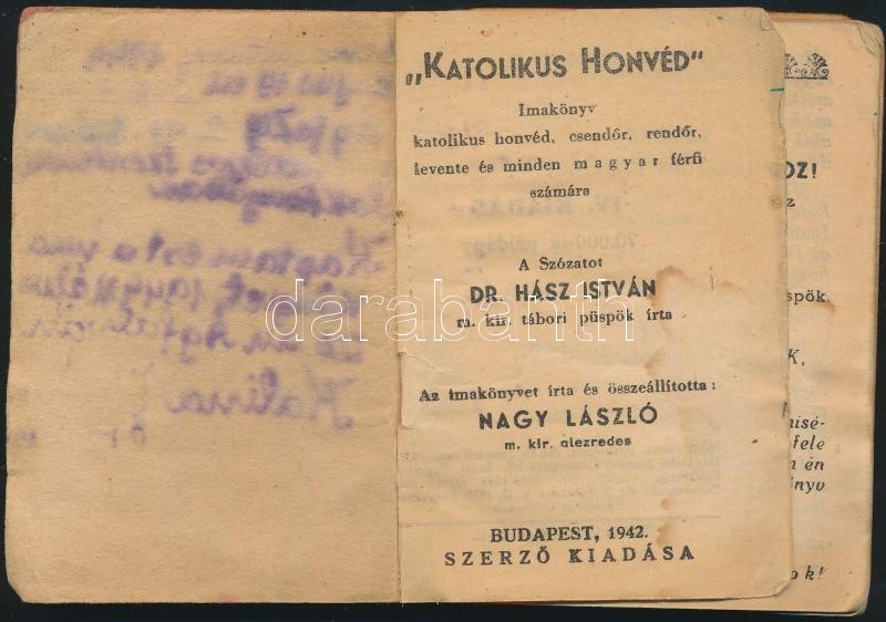 Nagy László: "Katolikus honvéd." Imaköny katolikus honvéd, csendőr, rendőr, levente és minden magyar férfi számára. A szózatot Dr. Hász István m. kir. tábori püspök írta. Az imakönyvet írta és összeállította. Bp.,1942, Szerzői, Gyöngyös, Árviz Ferenc-ny.), 191+1 p. IV. kiadás. Kiadói félvászon-kötés, kopott borítóval, sérült gerinccel és kötéssel, frontot megjárt soproni őrvezető bejegyzésével. .
