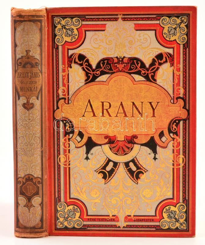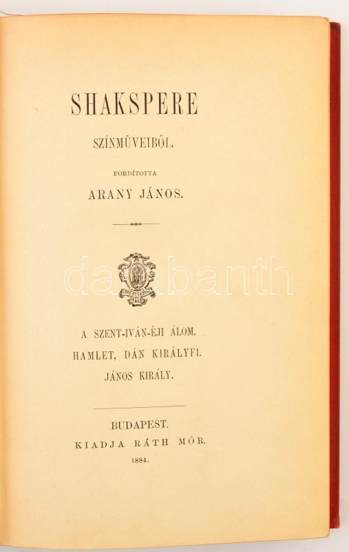 Arany János összes munkái. VI. köt. Drámai fordítások. Shakspere színműveiből.: A szent-iván-éji álom., Halmlet, dán királyfi., János Király. Bp., 1884, Ráth Mór,6+475+5p. Kiadói dúsan aranyozott, festett egészvászon-kötés, Gottermayer-kötés, kis kopásnyomokkal, a gerinc két vége kopott.