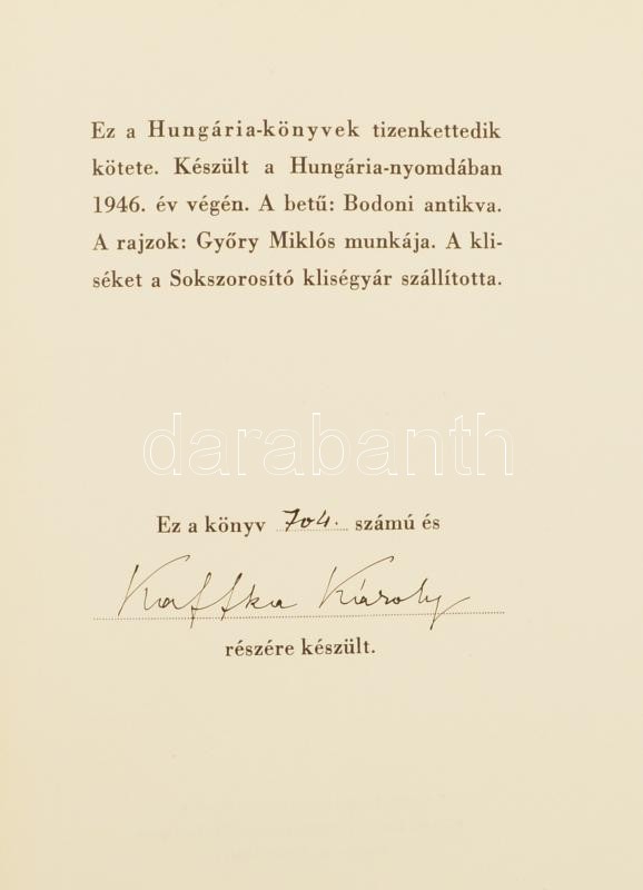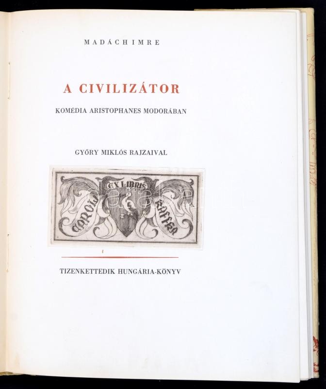 Madách Imre: A civilizátor. Komédia Aristophanes Modorában. Győry Miklós rajzaival. Hungária könyvek 12. Bp., 1946, Hungária ny. Egészvászon kötésben, papír védőborítóval. Sorszámozott, Győry Miklós illusztrátor által dedikált példány!