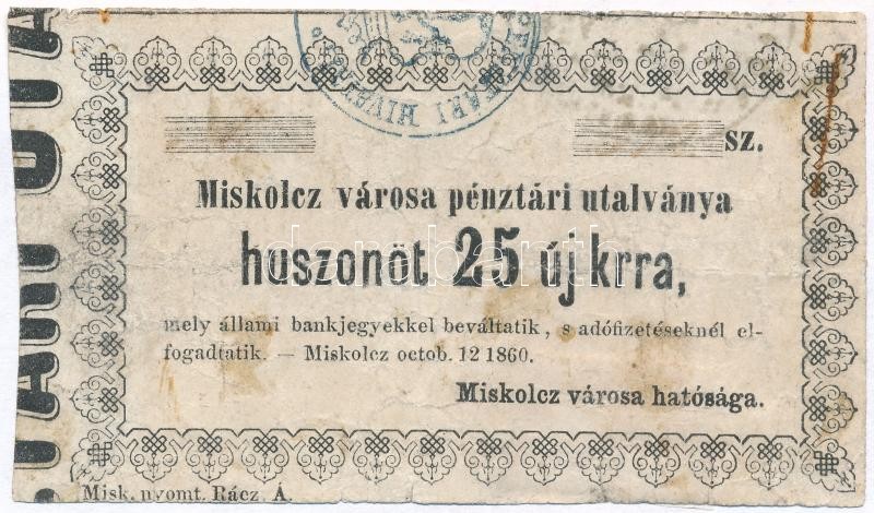 https://www.darabanth.com/en/354-Online-auction/354.0/Numismatics/Emergency-Coins-and-Notes~1500006/Miskolc-1860-25kr-Miskolcz-varosa-penztari-utalvanya-TIII-ragasztas~II2017120