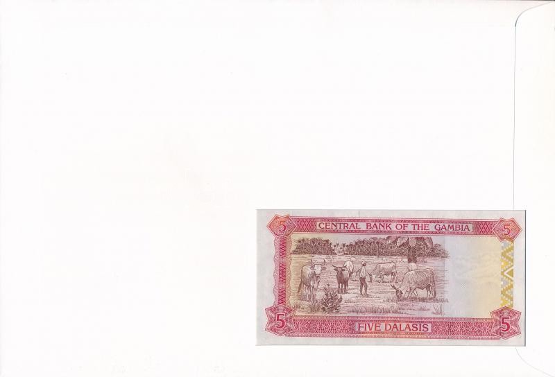 Gambia 1991-1995. 5 Dalasis in envelope with stamps and cancellations C:UNC