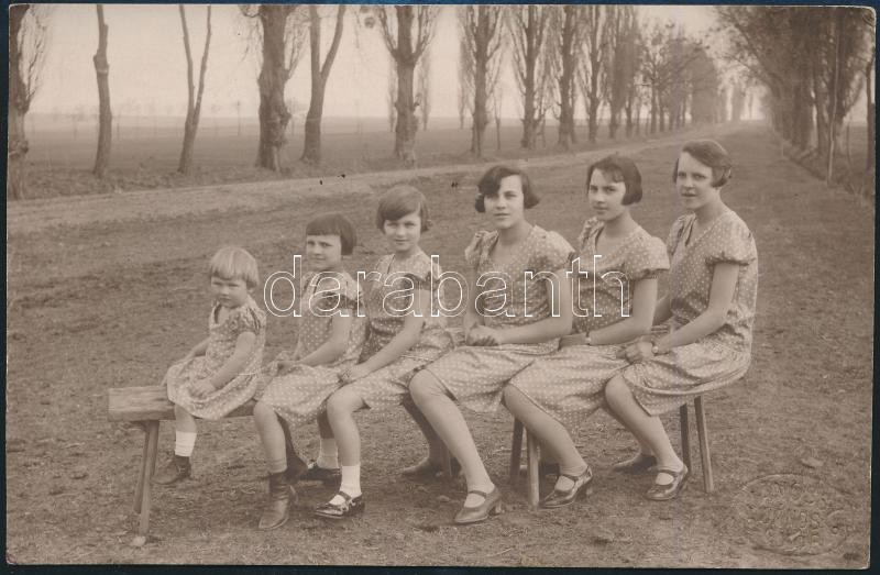 1928 "A hat Szupper lány" fotólap, feliratozva, Jánossy János győri műterméből, 9×13,5 cm