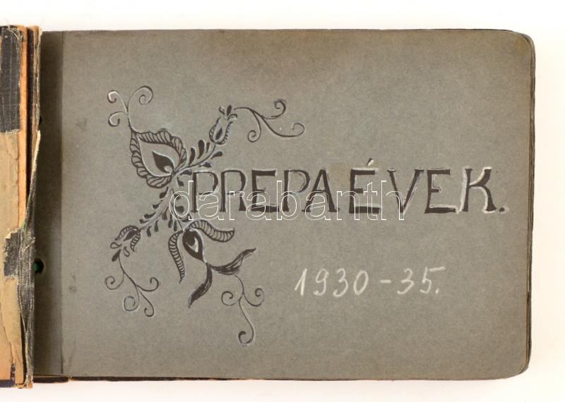 1930-1935 "Prepaévek", diáklány fotóalbuma, benne kirándulások képeivel: Szeged, Pannonhalma, Majk, Herend, Sümeg, stb., részben feliratozva