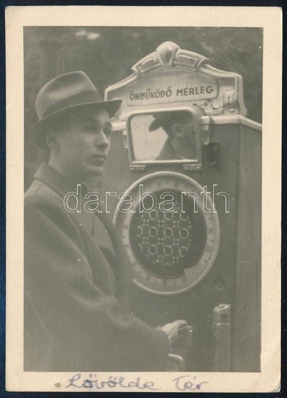 cca 1925-1930 Önműködő mérleg a budapesti Lövölde téren, fotó, jó állapotban, 10,5×ő7,5 cm