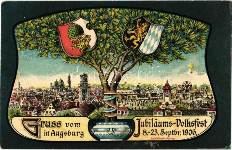 Description: 1906 Augsburg, Jubiläums-Volksfest 8-23. September 1906. / 100th anniversary festival of Augsburg, balloon, coat of arms. Art Nouveau, litho s: G. Stempfle (fl)
