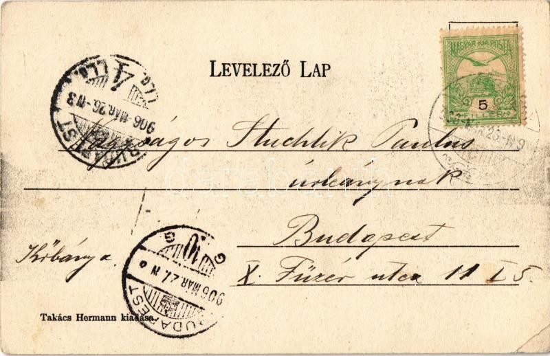 1906 Jászberény, Fő tér, Schwarcz Hermann bor, sör és pálinka mérése, Jászsági Hitelintézet és Takarékpénztár. Takács Hermann kiadása (EK)