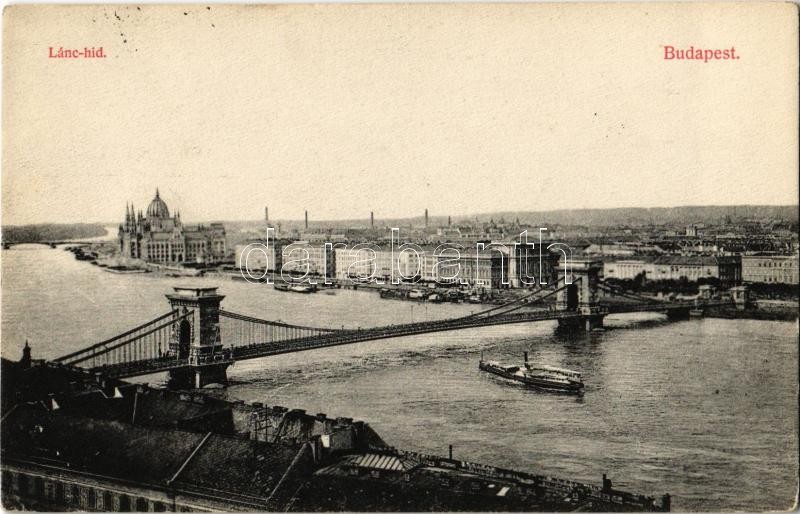 1908 Budapest, Lánchíd, Parlament, gőzhajó. Divald Károly műintézete 6...