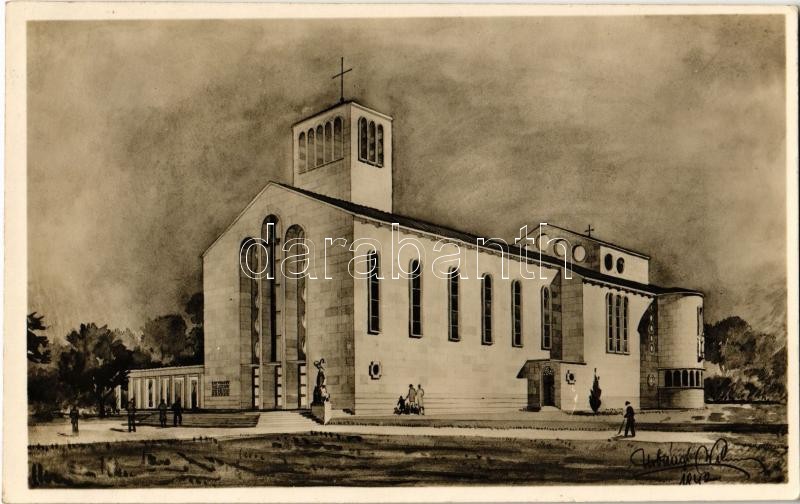Budapest XXII. Budafok, Felsővárosban építendő Római katolikus Jézus Szíve templom külső látképe. Tervezte: urbányi Vilmos építőművész, építészmérnök