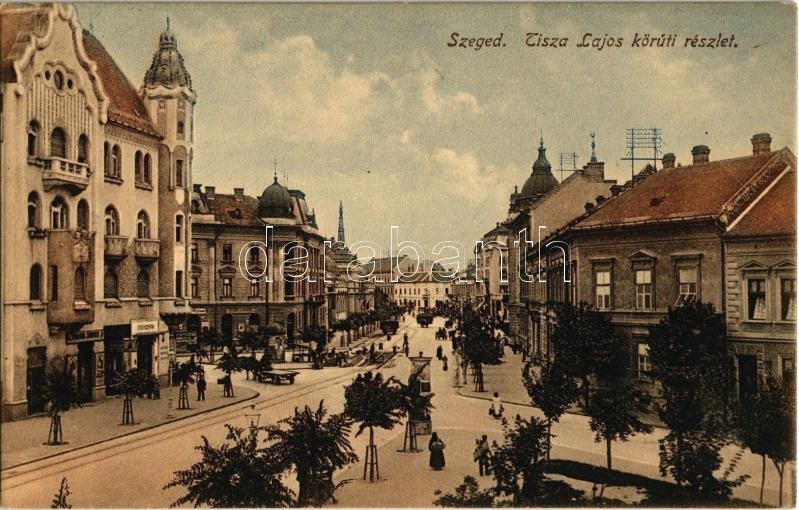 Szeged, Tisza Lajos körút, Gyógyszertár, Fodor János, Kováts üzlete, villamossín fektetése