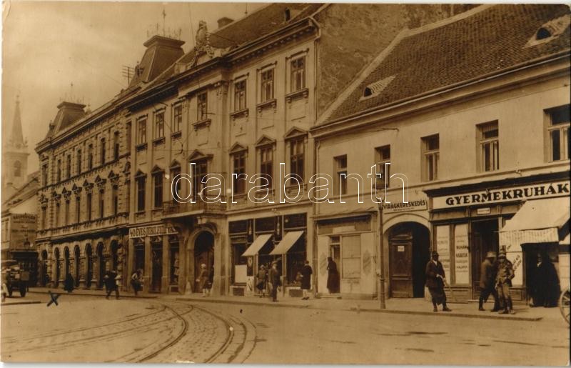 Szombathely, Premontrei régi és új rendház, Berkes Pálné virágkereskedése, Gyermekruhák, Heinz Gyula és Rasperger üzlete, villamossín. photo