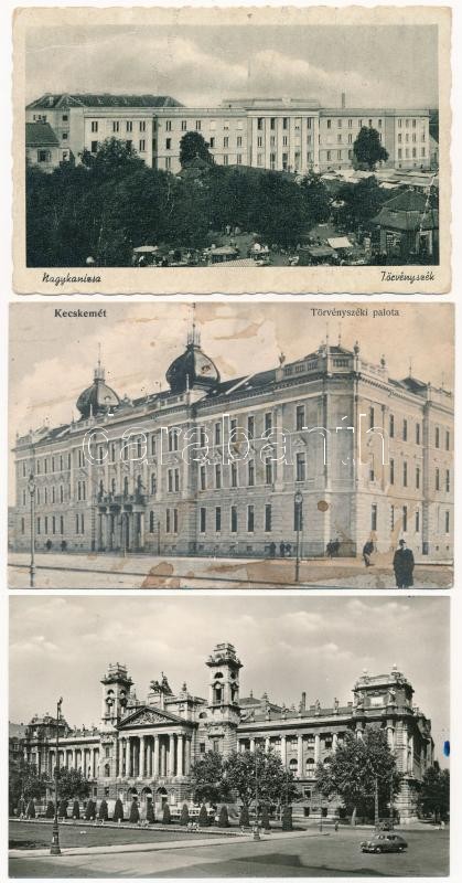 6 db főleg régi magyar városképes lap, törvényszékek: Komárom, Rimaszombat, Kecskemét, Sepsiszentgyörgy, Nagykanizsa, Budapest / 6 mainly pre-1945 Hungarian town-view postcards with courts; Komárno, Rimavská Sobota, Kecskemét, Sfantu Gheorghe, Nagykanizsa, Budapest