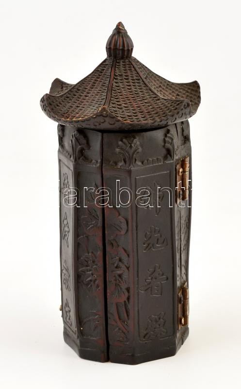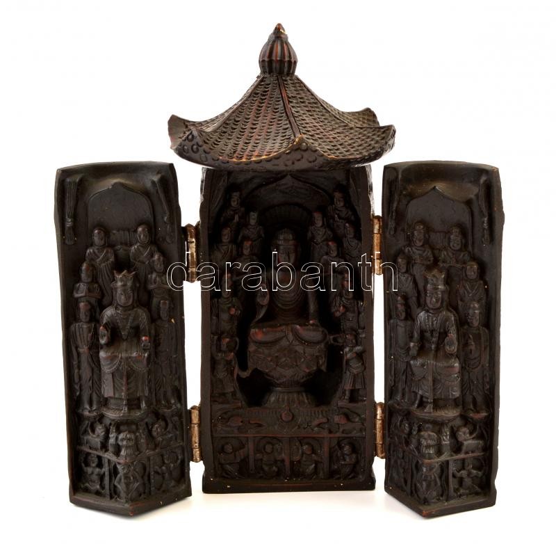 Kínai Buddhás műgyanta triptichon, kopott, m: 22 cm