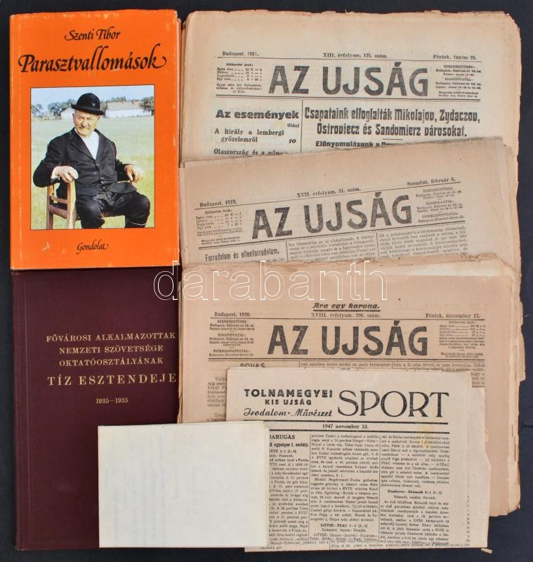 1915-1985 Vegyes könyv és papírrégiség tétel. Közte: Szenti Tibor: Parasztvallomások. Gazdák emlékezése Vásárhelyről. Bp.,1985, Gondolat. Fekete-fehér fotókkal illusztrált. Kiadói egészvászon-kötés, kiadói papír védőborítóban. Fővárosi Alkalmazottak Nemzeti Szövetsége Oktatóosztályának tíz esztendeje. 1925-1935. Szerk.: Dausz Gyula. Bp.,(1936), Fővárosi Alkalmazottak Nemzeti Szövetsége Oktatóosztálya, 38+2 p.+ 6 t. (fekete-fehér képtáblák.) Kiadói aranyozott egészvászon-kötésben. 1915-1920 Az Ujság 6 száma, közte 3 db 1919-essel, benne érdekes korabeli hírekkel, szakadozottak, sérültek. 1946 Légrády Ottó (1878-1948) újságíró és kiadó aláírása egy Budapest Székesfővárosa II. ker. Elöljáróságának, magánügyben küldött levélen. 1947 Tolnamegyei Kis Újság Sport 1947. okt. 18., nov. 22., hajtásnyommal, az egyik szám szélein szakadással, 2x4 sztl. lev.