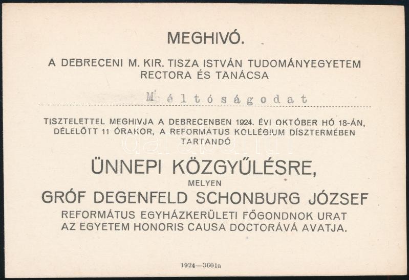Description: 1924 Debrecen, Meghívó a Debreceni M. Kir. Tisza István Tudományegyetem ünnepi közgyűlésére, melyen honoris causa doctorrá avatják gróf Degenfeld Schonburg Józsefet