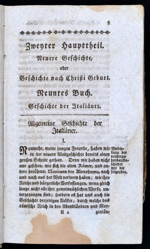 Description: Johann Matthias Schröckh: Allgemeine Weltgeschichte für Kinder. Leipzig, 1789, Weißmannischen Buchhandlung, 4+506 p. Német nyelven. Kartonált papírkötésben, sérült elülső kötéstáblával, kissé sérült gerinccel, foltos.