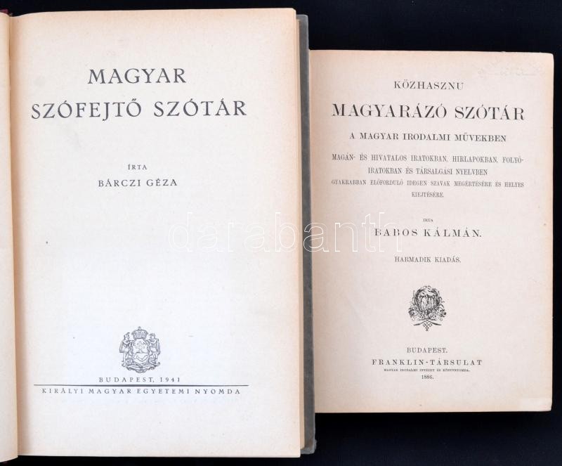 Description: Bárczi Géza: Magyar szófejtő szótár. Bp., 1941, Kir. M. Egyetemi Nyomda, 348 p. +1 t. Kiadói félvászon kötés.+Babos Kálmán: Közhasznu magyarázó szótár a nyelvünkben gyakrabban előforduló idegen szavak és szólások megértésére és helyes kiejtésére. Bp.,1886, Franklin, 344 p. Harmadik kiadás. Kiadói aranyozott egészvászon-kötés.