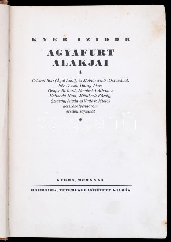 Kner Izidor: Kner Izidor Agyafurt alakjai. Csicseri Bors (Ágai Adolf), Molnár Jenő előszavával. Bér Dezső, Garay Ákos, Geiger Richárd, Homicskó Athanáz, Kalivoda Kata, Mühlbeck Károly, Szigethy István, Vadász Miklós 253 eredeti rajzával. Gyoma, 1926, Kner Izidor, 367 p. Harmadik, tetemesen bővített kiadás. Kiadói félvászon kötés, kopott borítóval és gerinccel.