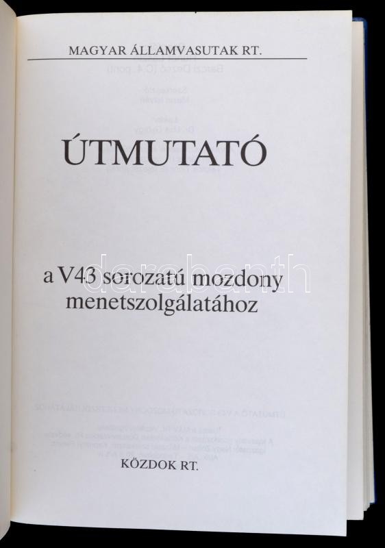 Hunor László-Barczi Dezső: Útmutató a V43 sorozatú mozdony menetszolgálatához. Bp.,é.n.,KÖZDOK. Kiadói nyl-kötés, egy-két helyen ceruzás bejelöléssel.