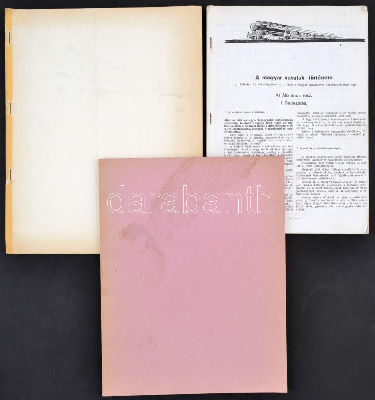 Description: Orenstein és Koppel 806. számú főmintajegyzékének fénymásolt példánya. [Vasúti sínek, kocsik, mozdonyok árjegyzéke.], 98 p. +Zelovich Kornél: A magyar vasutak története c. könyv fénymásolt példánya, hiányos, 9-60 p.+Pecz Kornél: Síkpálya gyorsvonatú lokomotívok c. könyv fénymásolt példánya.