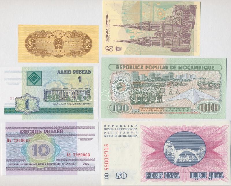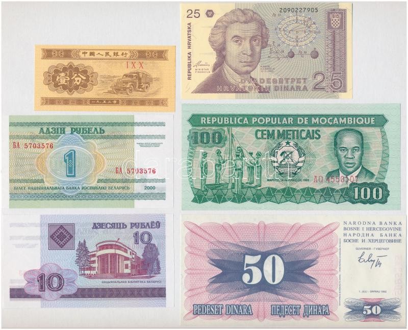 Description: 6db-os vegyes külföldi bankjegy tétel, közte Mozambik 1983. 100M, Bosznia-Hercegovina 1992. 50D T:I,I-