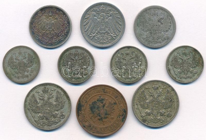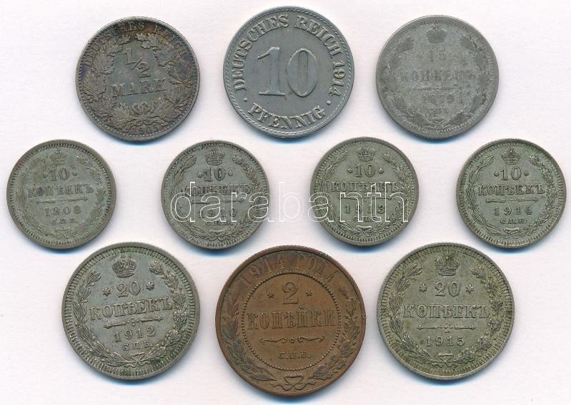 Mixed: German Empire 1905. 1/2 Mark Ag + 1914. 10 Pfennig Cu-Ni + Russian Empire 1879. 15 Kopeks Ag + 1908-1914. 10 Kopeks Ag + 1912. 20 Kopeks Ag + 1914. 2 Kopeks Cu + 1915. 20 Kopeks Ag C:XF-F
