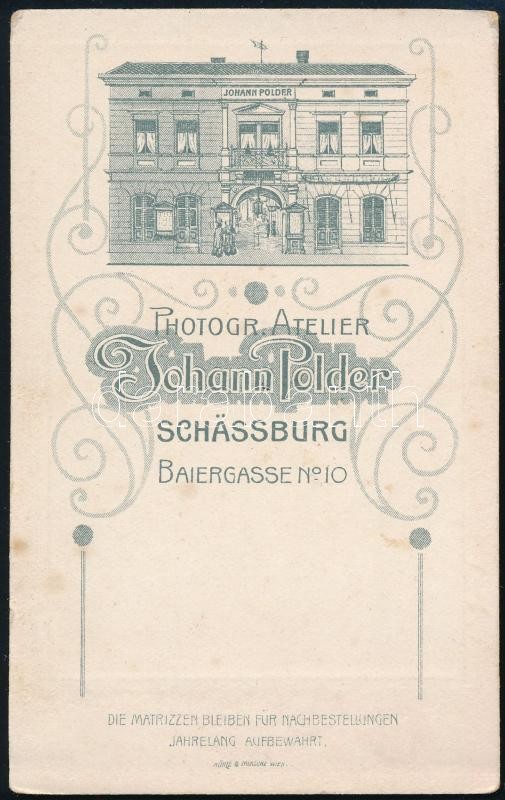 Description: cca 1905 Kisfiúk játékpuskával és karikával, keményhátú fotó Johann Polder segesvári műterméből, hátoldalon a műterem ábrázolásával, jó állapotban, 11×6,5 cm
