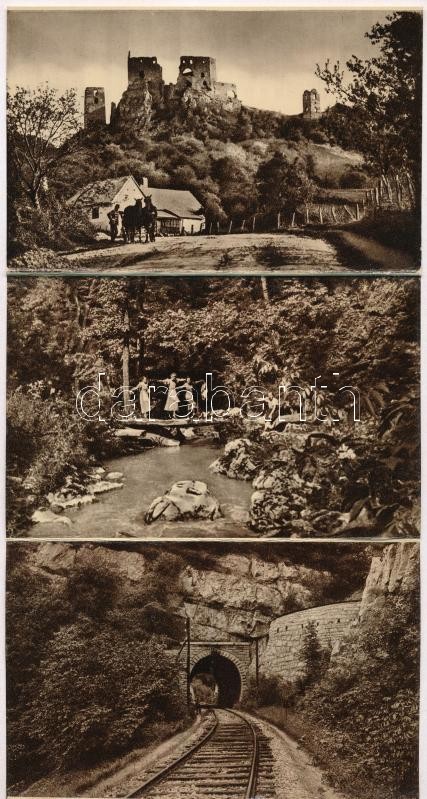 Bakonyszentlászló, Czuha völgyi részletek. leporellólap, belül Cuha-völgyi vasútvonal és vasúti alagút, gőzmozdony, Csesznek vára