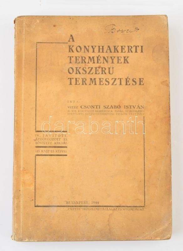 Csonti Szabó István: A konyhakerti termények okszerű termesztése. Bp.,1944, Pátria. IV., átdolgozott és bővített kiadás. Fekete-fehér fotókkal illusztrált. Kiadói papírkötésben, kopott, foltos borítóval.