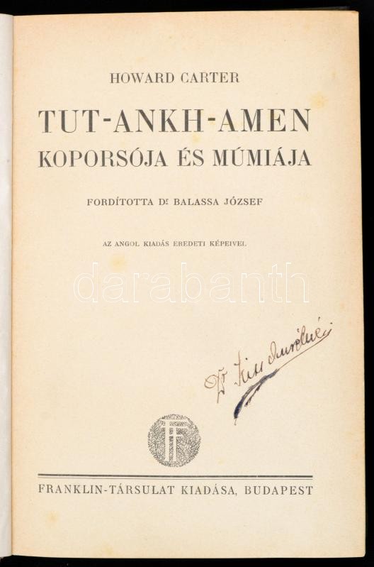 Howard Carter: Tut-Ankh-Amen koporsója, és múmiája. Fordította: Dr. Ba... https://www.darabanth.com/en/356-Online-auction/356.0/Books/Books-History~1000004/Howard-Carter-Tut-Ankh-Amen-koporsoja-es-mumiaja-Forditotta-Dr-Balassa-Jozsef-Bp-en~II2033464