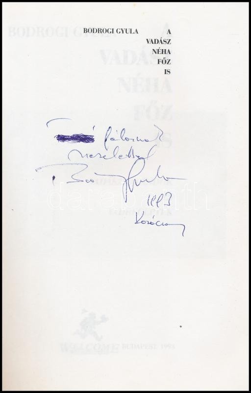 Bodrogi Gyula: A vadász néha főz is. Bp.,1993, Welcome. Fekete-fehér fotókkal. Kiadói papírkötés. A szerző dedikációjával.