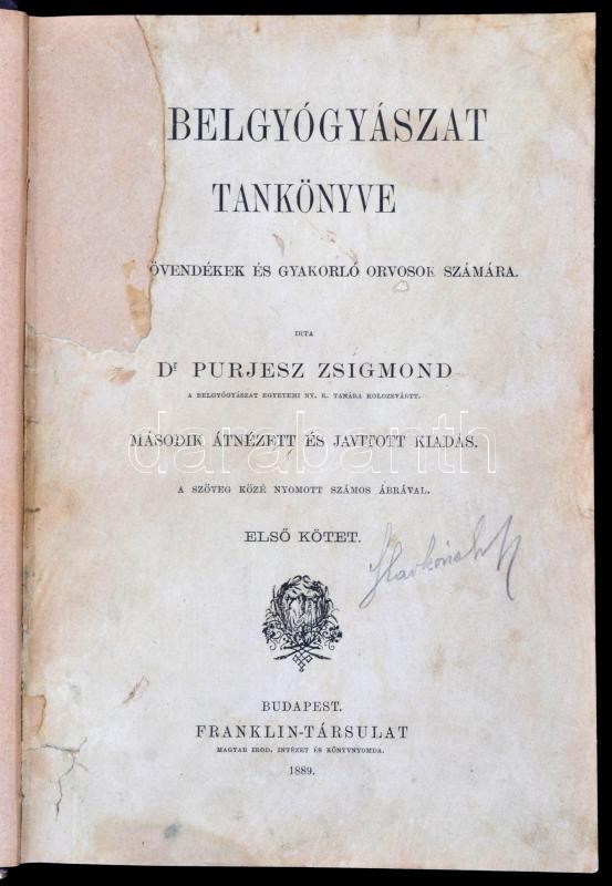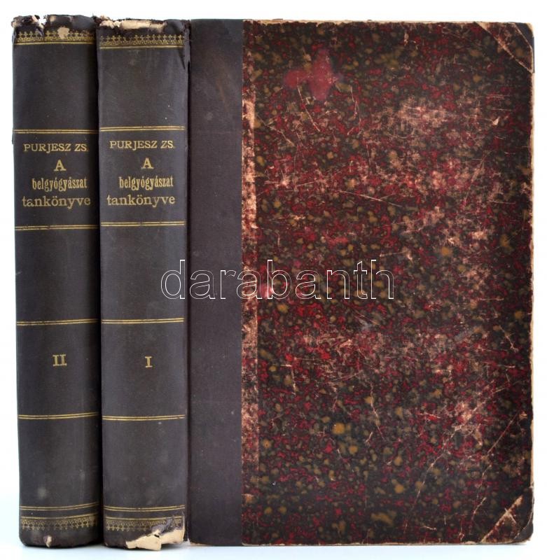 Dr. Purjesz Zsigmond: Belgyógyászat tankönyve. I-II. kötet. Növendékek és gyakorló orvosok számára. Bp.,1889, Franklin, 664+3-672 p. Második, átnézett és javított kiadás. Átkötött kopott félvászon-kötés, kissé sérült gerinccel, a II. kötet elején hiányzó címlappal.