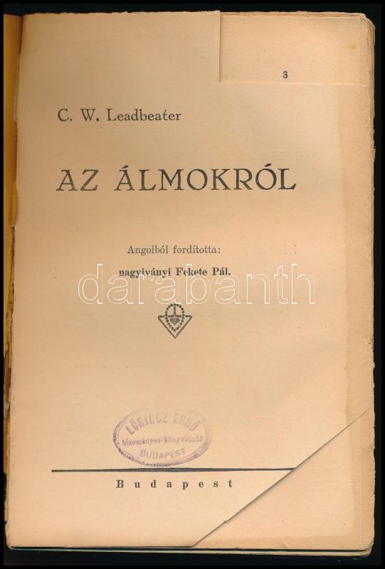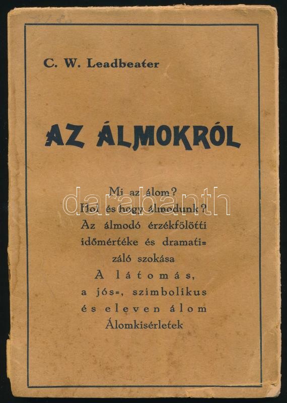 C(harles) W(ebster) Leadbeater: Az álmokról. Mi az álom? Hol és hogy álmodtunk? Az álmodó érzékfölötti időmértéke és dramatizáló szokása. A látomás, a jós-, szimbolikus és eleven álom. Álomkísérletek. Fordította: Fekete Pál. Bp.,[1930], Hauptmann Béla, 64 p. Kiadói papírkötés, a borítón és a gerincen szakadásokkal, kissé foltos borítóval, címlapon hiánnyal, kivágásokkal. A címlapon Lőrincz Ernő bizományos és könyvkiadó bélyegzőjével.