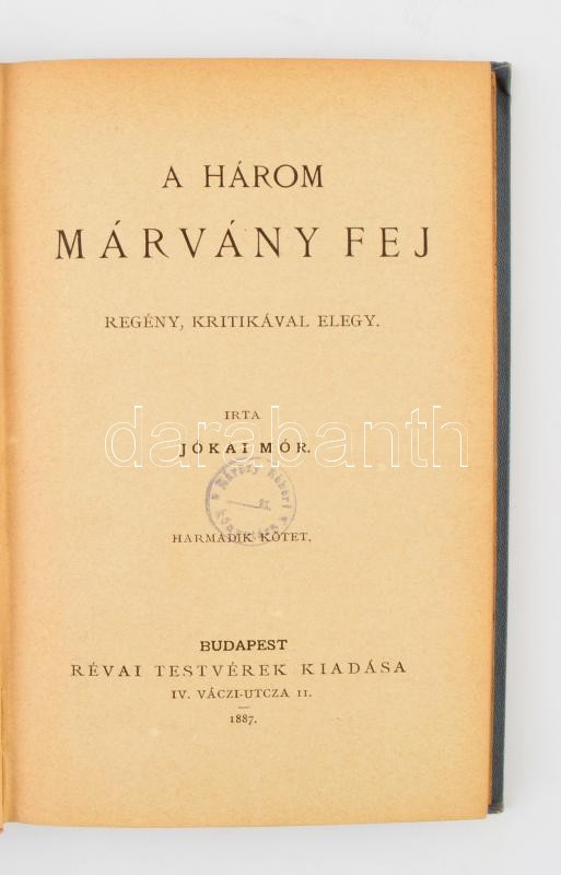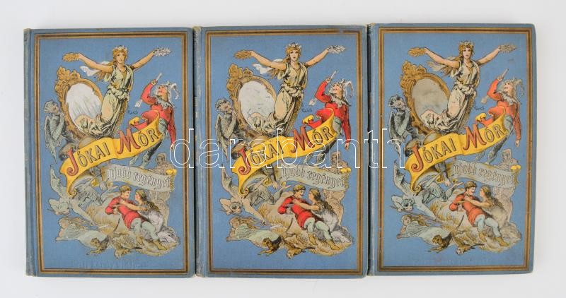 Jókai Mór: A három márvány fej. I-III köt. Regény, kritikával elegy. Bp., 1887, Révai,211+1;+187+1;+236+1 p. Kiadói aranyozott, festett, illusztrált egészvászon díszkötésben, Gottermayer kötés, kopott gerinccel, kissé kopott borítóval.