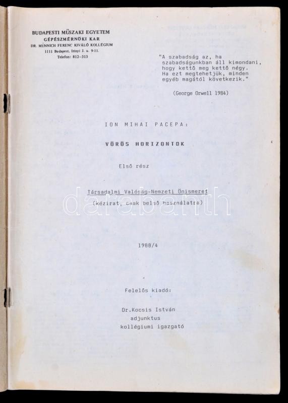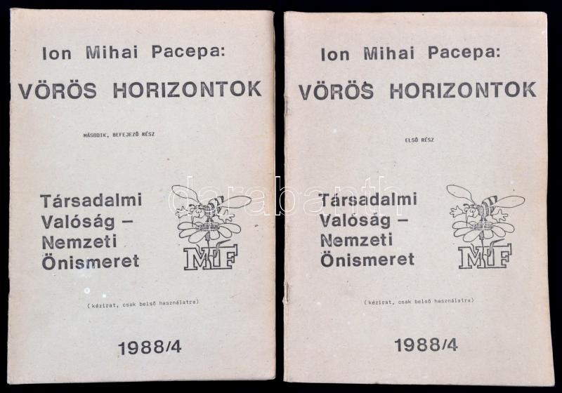 Description: Pacepa, Ion Mihai: Vörös horizontok. 1-2. rész. Társadalmi valóság - nemzeti önismeret. Kézirat, belső használatra. Bp., 1988, BME GK Münnich Ferenc Kollégium. Kiadói papírkötés.