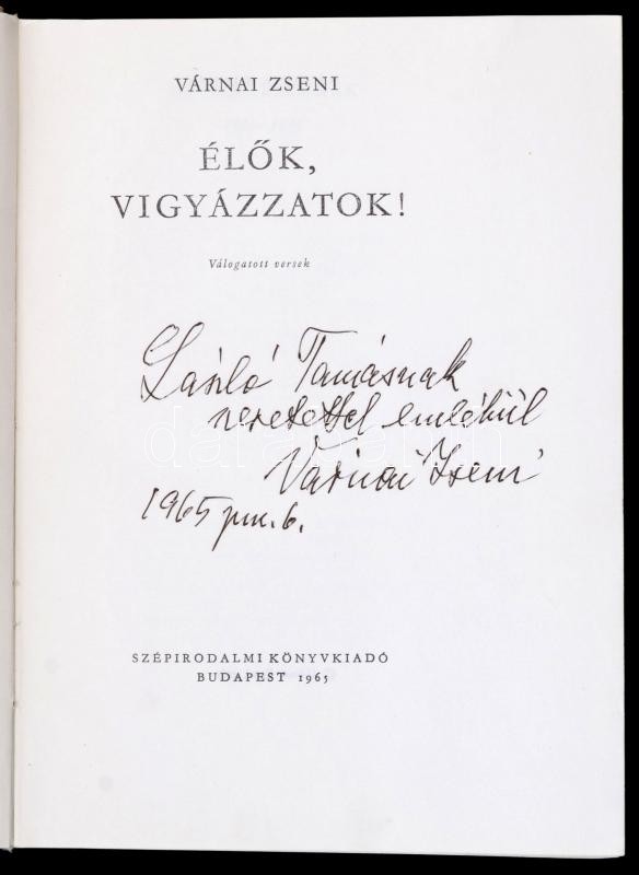 Várnai Zseni: Élők, vigyázzatok! Bp.,1965, Szépirodalmi. Kiadói egészvászon-kötés. A szerző által dedikált.