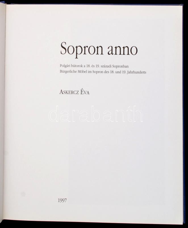 Askercz Éva: Sopron anno-Polgári bútorok a 18. és 19. századi Sopronban (kétnyelvű) Fekete Cédrus Könyvkereskedés, 1997. Kiadói kartonálás