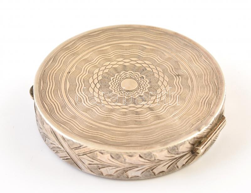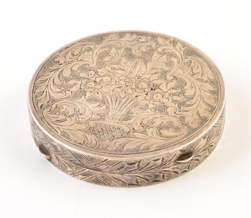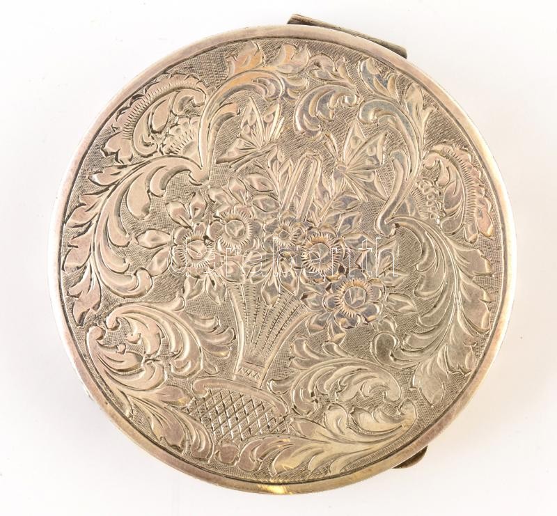 Díszes, jelzett ezüst púderes dobozka 59,4 g d:6,54 cm