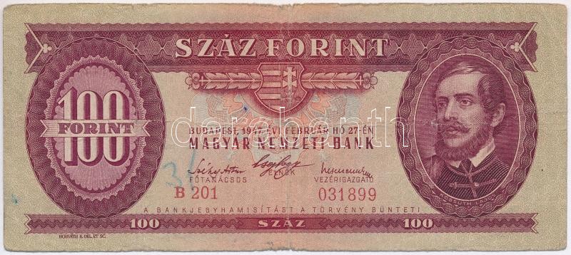 1947. 100Ft "B201" T:III- középen, hajtás mentén ly.