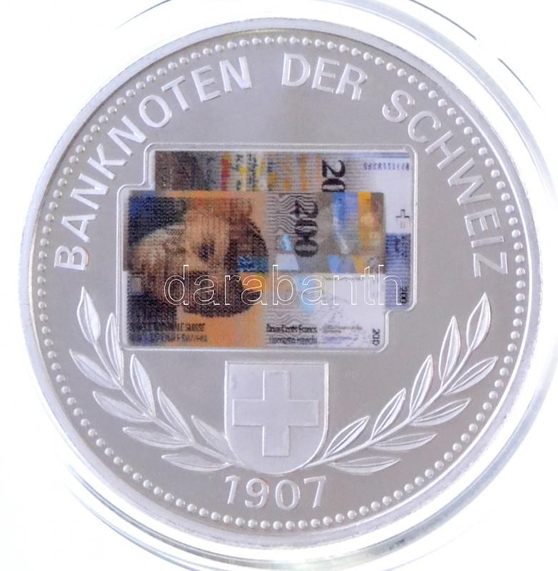 Svájc DN "Banknoten der Schweiz 1907 / Billets de Banque de Suisse - Banconote della Svizzera" ezüstözött Cu-Ni emlékérem 200Fr svájci bankjegy multicolor képével, tanúsítvánnyal (40mm) T:PP Switzerland ND "Banknoten der Schweiz 1907 / Billets de Banque de Suisse - Banconote della Svizzera" silver plated Cu-Ni commemorative medallion with the multicolor image of 200 Francs banknote, with certificate (40mm) C:PP