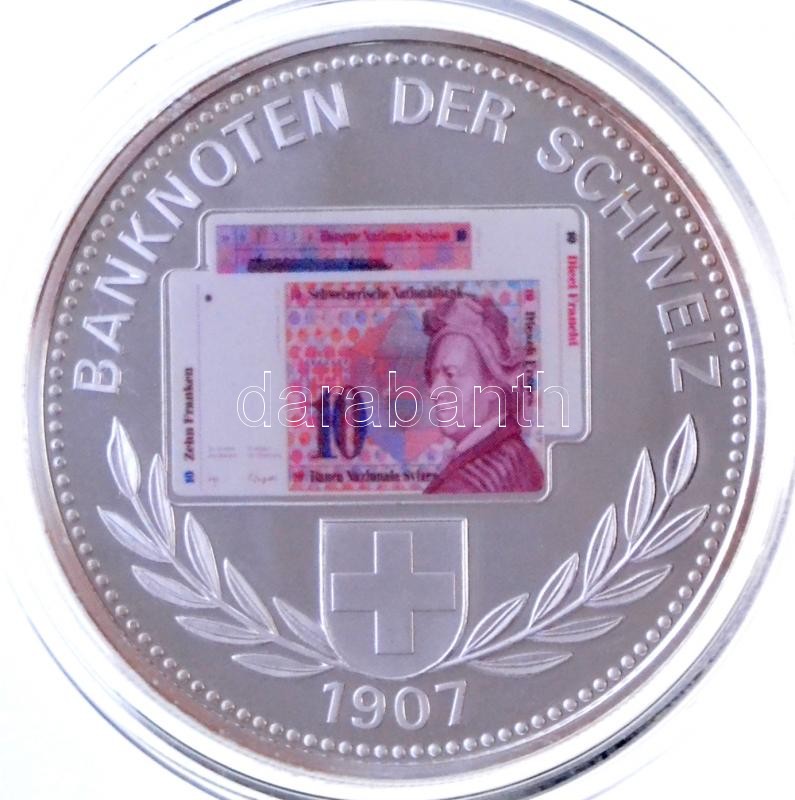 Svájc DN "Banknoten der Schweiz 1907 / Billets de Banque de Suisse - Banconote della Svizzera" ezüstözött Cu-Ni emlékérem 10Fr svájci bankjegy multicolor képével, tanúsítvánnyal (40mm) T:PP Switzerland ND "Banknoten der Schweiz 1907 / Billets de Banque de Suisse - Banconote della Svizzera" silver plated Cu-Ni commemorative medallion with the multicolor image of 10 Francs banknote, with certificate (40mm) C:PP