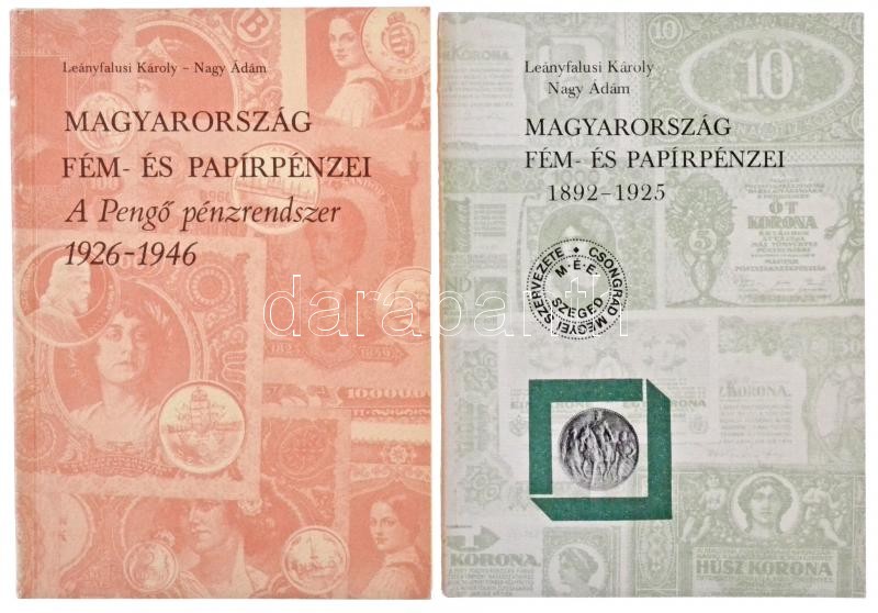 Description: Leányfalusi Károly - Nagy Ádám: Magyarország Fém- és Papírpénzei 1892-1925. MÉE Csongrád Megyei Szervezete, 1983. + Leányfalusi Károly-Nagy Ádám: Magyarország fém- és papírpénzei. A pengő pénzrendszer 1926-1946. Kecskemét, Magyar Éremgyűjtők Egyesülete Bács-Kiskun Megyei Szervezete, 1986.
