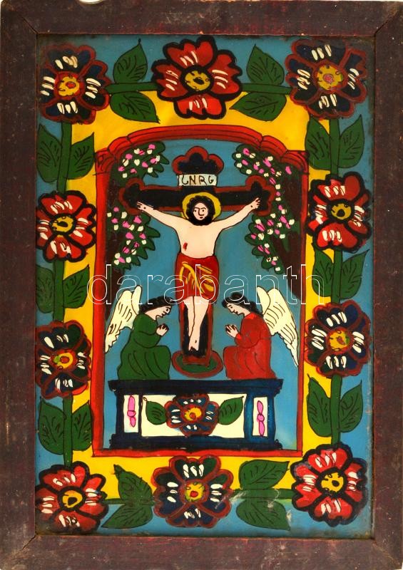 Jelzés nélkül: Krisztus a kereszten. Erdélyi festett üveg ikon, fa ker...