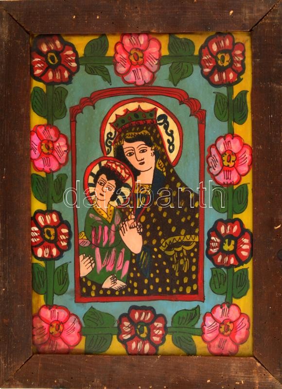 Jelzés nélkül: Mária a kis Jézussal. Erdélyi festett üveg ikon, fa ker...