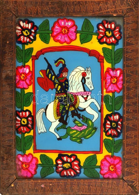 Jelzés nélkül: Sárkányölő Szent György. Erdélyi festett üveg ikon, fa ...