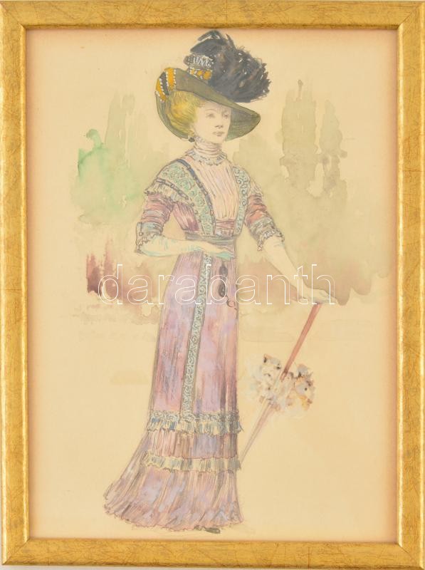 Jelzés nélkül: Viktoriánus hölgy napernyővel. Vegyes technika, papír, ...