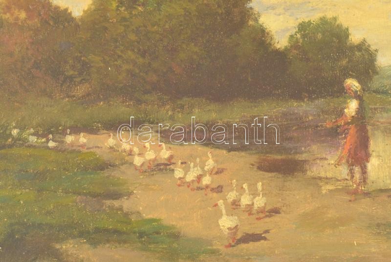 Neogrády László (1896-1962): Libapásztorlány. Olaj, karton, festék hibákkal, üvegezett hibás keretben, 20×30 cm
