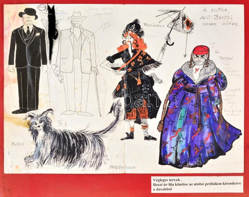 Parádi Katalin (1970-): A kutya, akit Bozzi úrnak hívtak c. előadás jelmeztervei. Vegyes technika, papír, jelzett, felcsavarva, 42×32 cm
